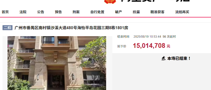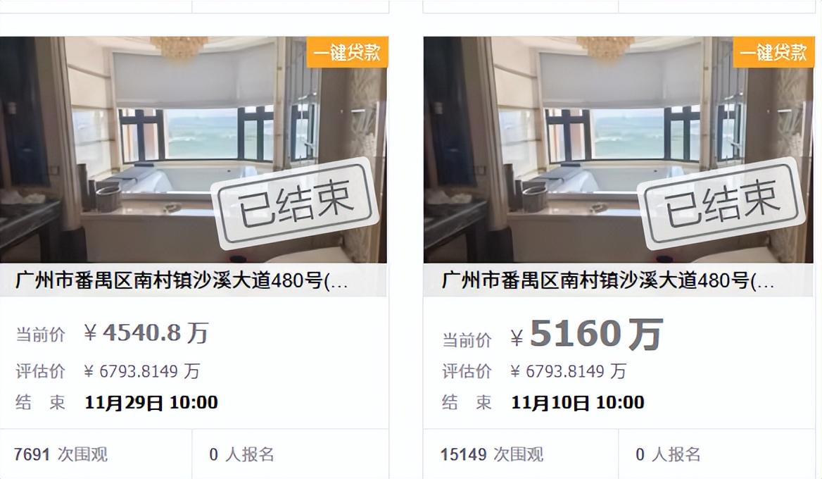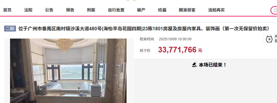 10月9日,国庆假期结束后的第一个上班日,在广州市司法拍卖市场上,就迎来了一套豪宅降价拍卖的最后时刻竞拍。一套位于位于广州市番禺区南村镇沙溪大道480号(海怡半岛花园四期)23栋1801房屋及房屋内家具、装饰画第二次拍卖。这套豪宅第一次拍卖的时候,起拍价是3752.4184万元倍倍网,评估价6490.58万元,最终拍卖没有人报名竞拍而流拍。