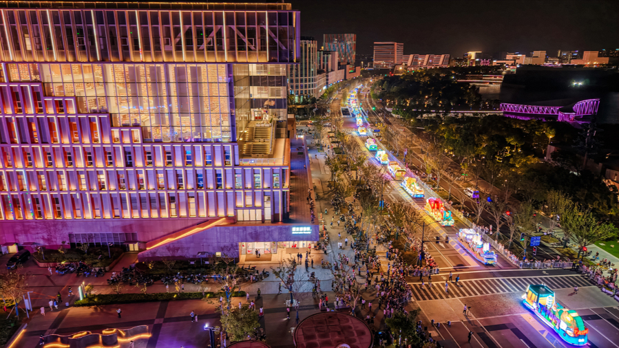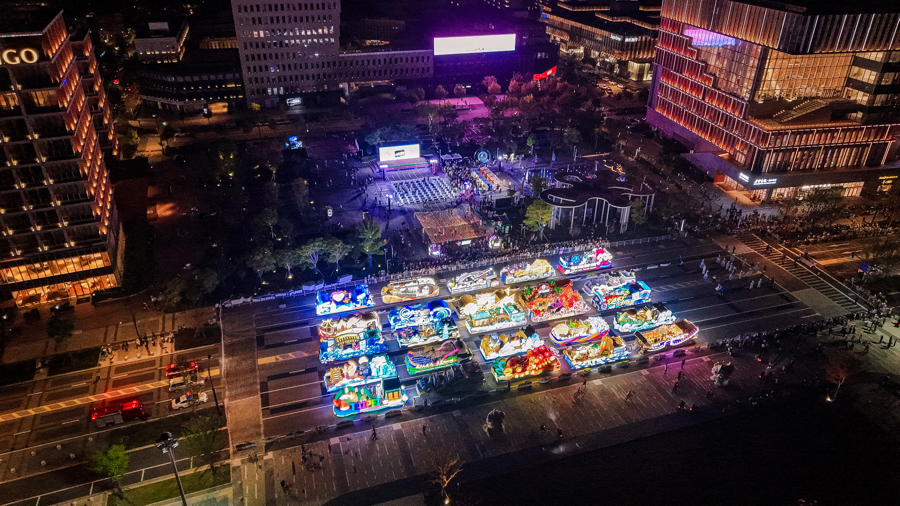 9月28日晚,临港新片区华灯璀璨、客流如织。傍晚六点半,第36届上海旅游节花车巡游临港新片区专场活动正式启动,25辆流光溢彩的花车在滴水湖畔如同流动的星河,从图灵广场出发,顺时针方向缓缓驶向滴水湖樱花岛。